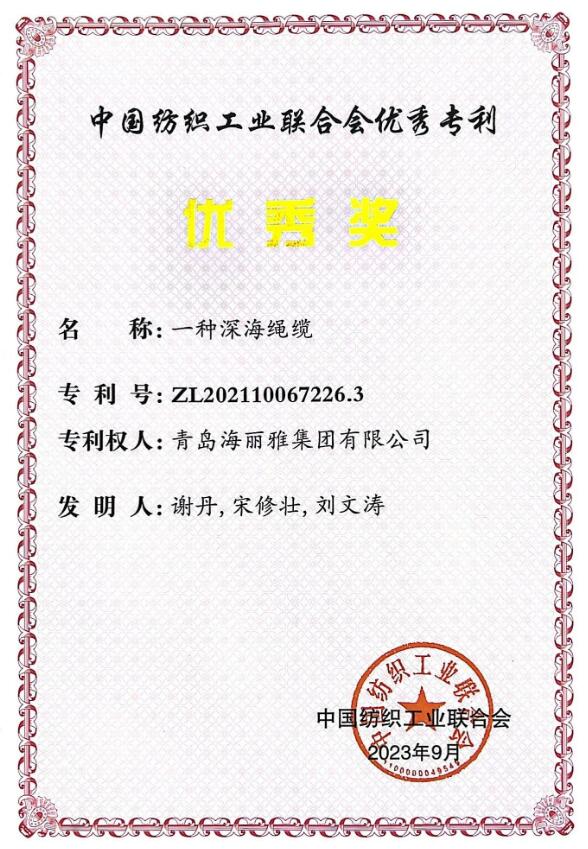 青島海麗雅集團(tuán)深海繩纜榮獲中國(guó)紡織工業(yè)聯(lián)合會(huì)優(yōu)秀專(zhuān)利獎(jiǎng)!