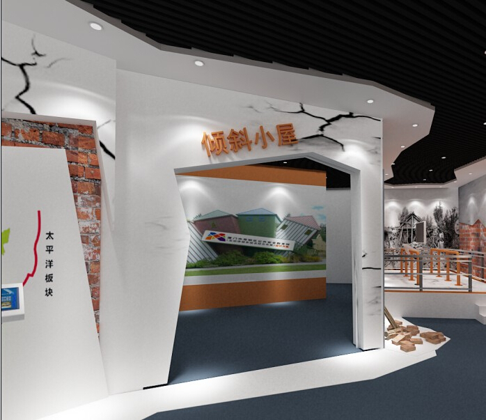 地震傾斜小屋展示目的:模擬一間建筑結(jié)構(gòu)被地震損壞的房間,走進(jìn)這里參觀者會(huì)有身臨其境的感覺。 地震傾斜小屋展示方式:參觀者走進(jìn)地震傾斜小屋,傾斜小屋通過地板與墻壁的傾斜,房屋內(nèi)的裝飾及窗子均平行傾斜,因此當(dāng)參觀者走進(jìn)小屋時(shí),并沒有感覺到房間是傾斜的,位于房間內(nèi)的裝飾環(huán)境同樣也是傾斜的,參觀者走進(jìn)其中會(huì)有強(qiáng)烈的眩暈感,在小屋墻壁的四周會(huì)設(shè)置一些扶手,防止參觀者在參觀途中跌倒。
