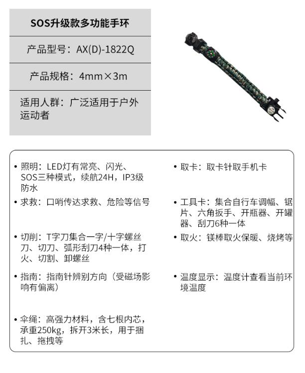 傘繩:高強(qiáng)力材料,包含七根內(nèi)芯,承重250kg,拆開3米長,用于捆扎、拖拽等。
