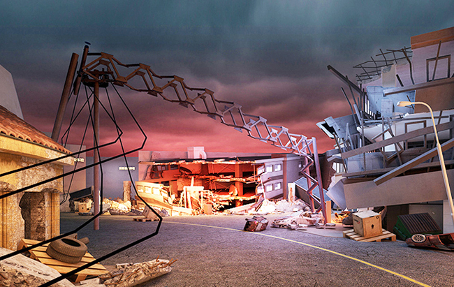 再現(xiàn)地震后,道路變形,有波浪狀也有斷裂上下錯層的場景。在道路兩側有建筑物倒塌,形成通道。體驗者從破損的通過穿過,到達一個相對安全的位置。在臨近出口處,設置一條斷掉的高壓電線掉落在地上,要求體驗者此處應該采取單腳跳的方式離開此區(qū)域。